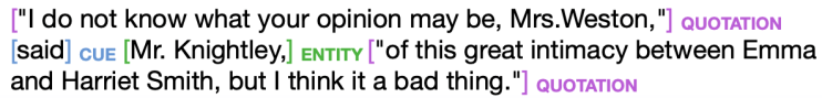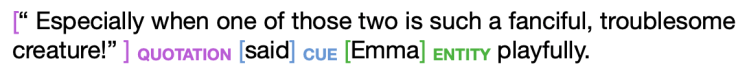RiQuA, Rich Quotation Annotations is a corpus that provides quotations for English literary text. RiQuA dataset consists of 15 excerpts from 11 works of 19th century English novels by 6 authors. Some of the works include Jane Austen’s ”Emma”, Anton Chekhov’s ”The Lady with the Dog” and Mark Twain’s ”The Adventures of Tom Sawyer”.