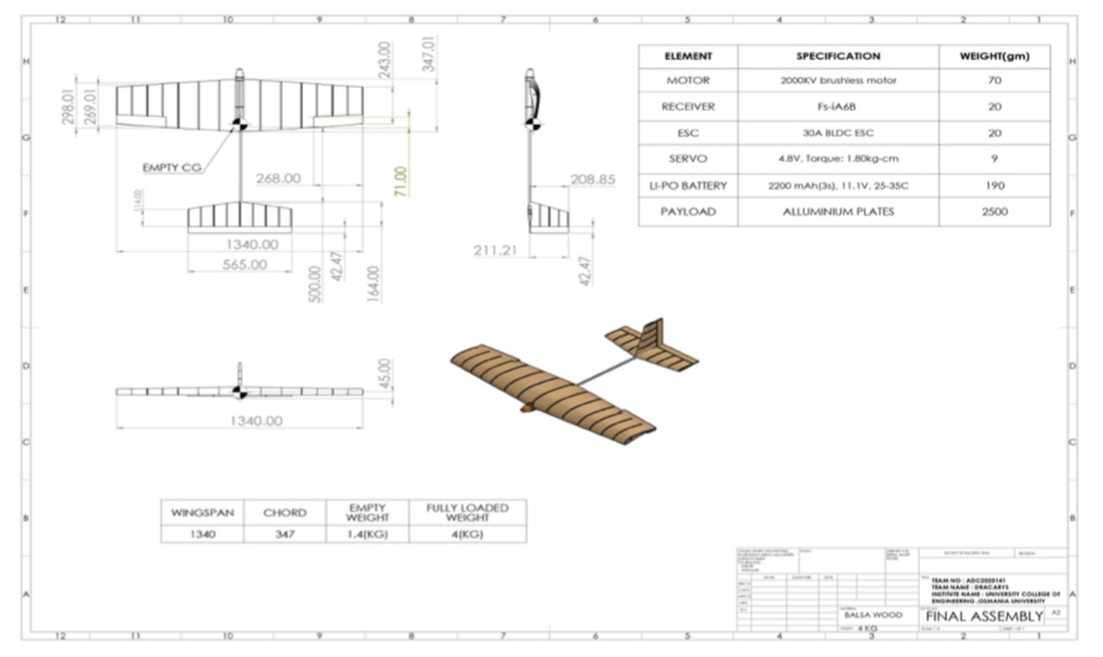 - Tail: Conventional tail structure with NACA 0012 was used to ensure stability with greater lift.