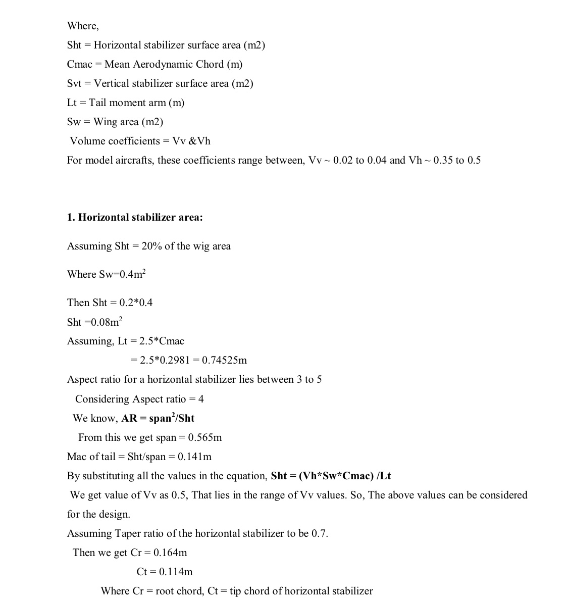 - Wing design: Aspect Ration and Wing loading for deciding the wing span and chord length.